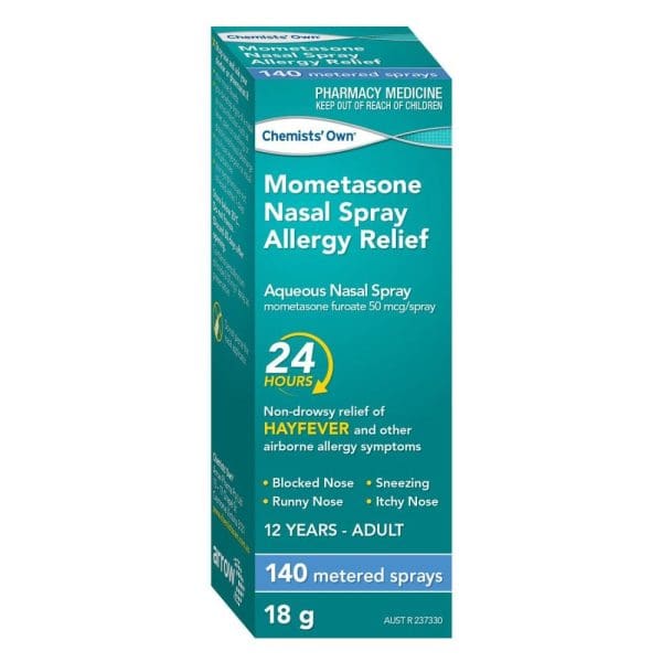 Chemists Own Allergy Relief Nasal Spray 50 mcg , for the treatment of symptoms associated with seasonal allergic rhinitis and perennial allergic rhinitis and the prophylaxis of seasonal allergic rhinitis for up to 6 months in adults and children 12 years of age and over. Non-drowy relief of hay fever and other airborne allergy symptoms .