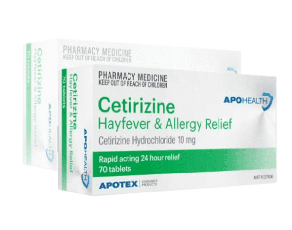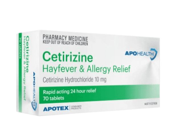 Apohealth Cetirizine 70 Tablets , is indicated for the relief of symptoms associated with seasonal allergic rhinitis (hay fever) in adults and children 6 years and over. Symptoms treated effectively include sneezing, rhinorrhea, post-nasal discharge, nasal pruritus, ocular pruritus, tearing, and redness of the eyes., Perennial allergic rhinitis: Cetirizine is indicated for the relief of symptoms associated with perennial allergic rhinitis in adults and children 6 years and over.