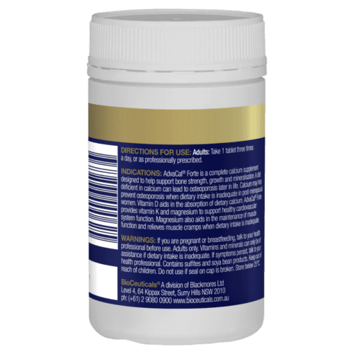 - Support your bone health with AdvaCal Forte tablets. It’s a calcium supplement designed to help support your bone strength, growth and mineralisation. This specially formulated supplement also provides vitamin D to help your body absorb calcium, support bone health and also supports your nervous and immune system health. AdvaCal Forte is formulated with vitamin K to help maintain the health of your arteries. Magnesium also relieves muscle cramps and supports energy levels. All of these benefits are packed into a dosage of one tablet three times a day.