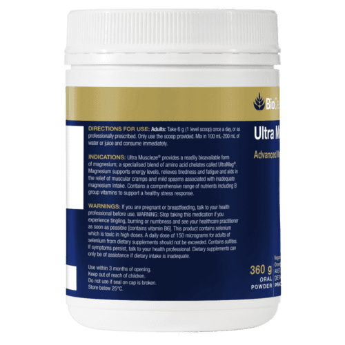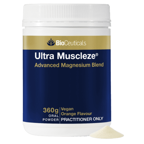 - Relieve muscle cramps and mild spasms when dietary intake is inadequate with Ultra Muscleze®. This greattasting practitioner formulated powder provides high strength bioavailable magnesium in two forms to support muscle relaxation. It also contains a specialised blend of amino acid chelates to help relieve tiredness and support a health stress response, and support your energy levels. This dietary supplement features a comprehensive range of nutrients including B group vitamins to support your body have a healthy stress response. Take one scoop once a day of this orange flavoured powder.