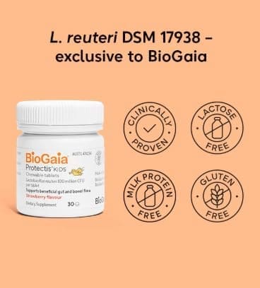 BioGaia Protectis Tablets for Kids is a dietary supplement scientifically formulated for children and teens. Non-GMO, each probiotic chewable for kids delivers 100 million live L. reuteri (DSM 17938) to help maintain gut balance. Shown to be suitable from age 3 years +, it’s the perfect dose of lactobacillus reuteri for kids in every chewable tablet.