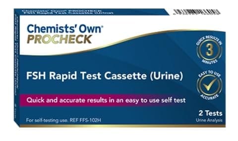 The Chemist’s Own Procheck rapid test is for the detection of increased Follicle-Stimulating Hormone (FSH) in a urine sample to aid in the detection of the onset of menopause. This test cannot determine fertility. It is advised to continue using contraception until the menopause status has been confirmed by a doctor.