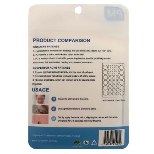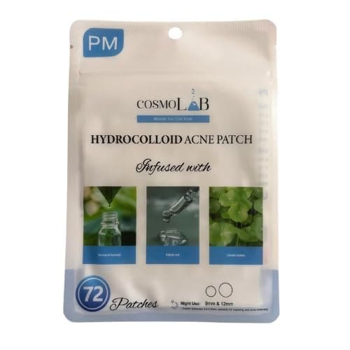 COSMOLAB PM Pack: Advanced Care for Blemish-Free Days Achieve flawless skin effortlessly with the COSMOLAB PM Pack, designed to provide superior care and protection for your blemishes. Each pack contains 72 hydrocolloid patches in two versatile sizes (9mm and 12mm), perfect for overnight healing. Why Choose COSMOLAB? Advanced Materials: Hydrocolloid: Mild, non-irritating, and highly effective at absorbing pus from acne. PU Base: Soft, adheres securely, and offers waterproof and breathable protection. Accelerated Healing: PU creates a moist environment that speeds healing and prevents scarring. Functional Invisible Design: Thicker patches (0.5–0.6mm) are primarily for repairing and healing overnight. In addition, our patches are infused with Tea tree oil, salicylic acid, and Centella which are all popular ingredients used in acne treatments, and each has unique properties that help with pimples Tea Tree Oil: Antibacterial and Anti-inflammatory: Tea tree oil has natural antimicrobial properties that can kill acne-causing bacteria, helping to prevent breakouts. It also reduces inflammation, effectively soothing irritated skin and reducing redness and swelling around pimples. Gentle on Skin: Tea tree oil is generally well-tolerated by most skin types, although it should be used in moderation to avoid irritation. Salicylic Acid: Exfoliation: Salicylic acid is a type of beta-hydroxy acid (BHA) that penetrates the pores and helps exfoliate dead skin cells. This prevents clogged pores, which is a major cause of pimples. Anti-inflammatory: It also reduces swelling and redness, making pimples less noticeable and promoting faster healing. Penetration of Pores: Salicylic acid’s ability to penetrate deep into the pores and break down excess oil is particularly effective for treating blackheads, whiteheads, and acne. Centella Asiatica (Cica): Healing and Soothing: Centella is known for its skin-healing properties. It promotes collagen production, which helps in repairing damaged skin and reducing scarring caused by acne. Anti-inflammatory: It calms irritation and redness, making it ideal for sensitive or inflamed skin. Hydration: Centella also helps to maintain skin hydration, which is crucial for keeping acne-prone skin balanced and preventing dryness that can lead to further breakouts. These ingredients are often combined in acne treatments to target different aspects of acne: tea tree oil for bacterial control, salicylic acid for pore-cleansing and exfoliation, and Centella for soothing and healing. How We Stand Out from Competitors: Unlike competitor patches that use allergenic glues, non-absorbent materials, and poor adhesives, COSMOLAB patches are gentle, breathable, and stay in place all day without causing additional breakouts. Elevate your skincare routine with the COSMOLAB PM Pack and experience the confidence of clearer skin!