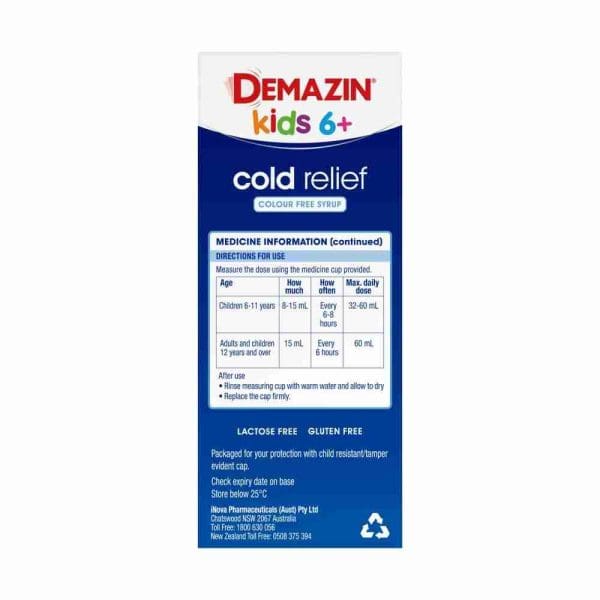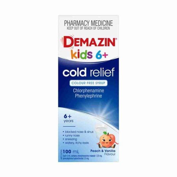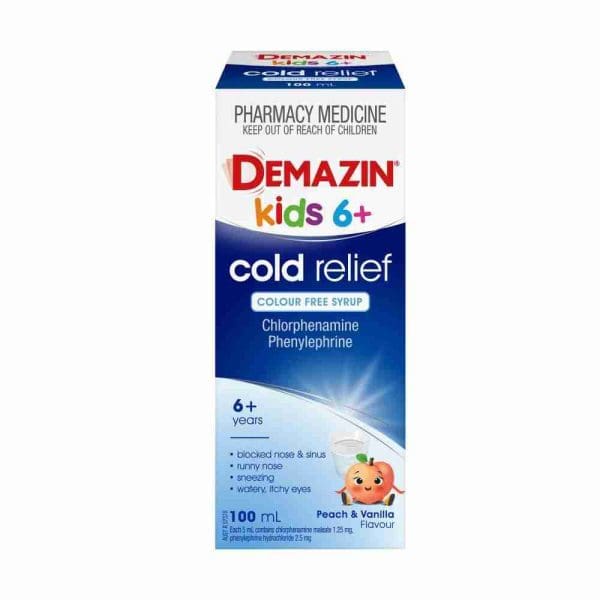 - Demazin Cold Relief Syrup is specifically formulated for children over 6 years and adults to provide relief from runny nose, blocked nose and sinuses, sneezing and watery, itchy eyes.
