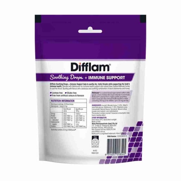 - Difflam Soothing Throat Drops + Immune Support help to soothe dry, tickly throats while supporting the body’s immune health. Blended with Wellmune for immune health support and natural New Zealand Manuka honey to coat the throat, Difflam Soothing Drops + Immune Support are bursting with the delicious and soothing flavours of elderberries and honey.