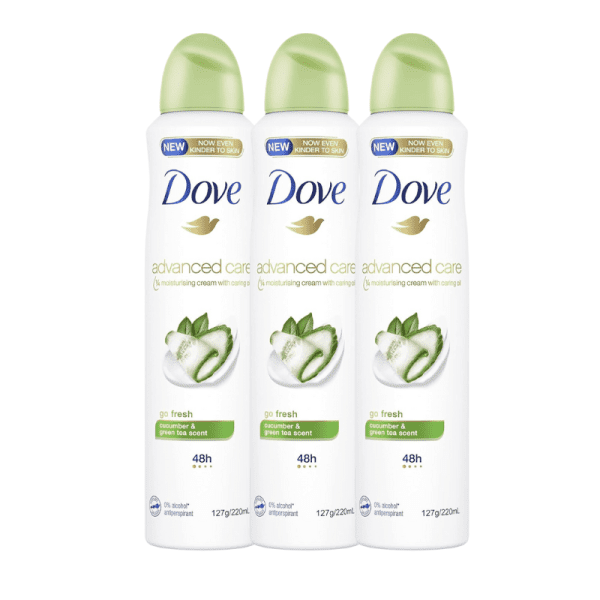 3* Dove Advanced Care Antiperspirant Aerosol Deodorant Go Fresh Cucumber & Green Tea 220ml (packaging may vary)