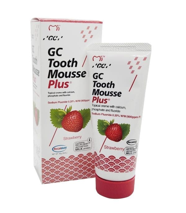 GC Tooth Mousse™ Plus Strawberry is a delicious tasting crème containing a milk-derived protein called RECALDENT™ with incorporated fluoride (CPP-ACPF: casein phosphopeptide-amorphous calcium phosphate fluoride). The level of fluoride is 900ppm. In GC Tooth Mousse™ Plus Strawberry, the soluble form of RECALDENT™ with incorporated fluoride (CPP-ACPF) is used to provide extra protection for teeth, neutralising, and buffering acids in the mouth, remineralising, strengthening and brightening enamel. This helps to prevent tooth decay, erosion, and sensitivity.