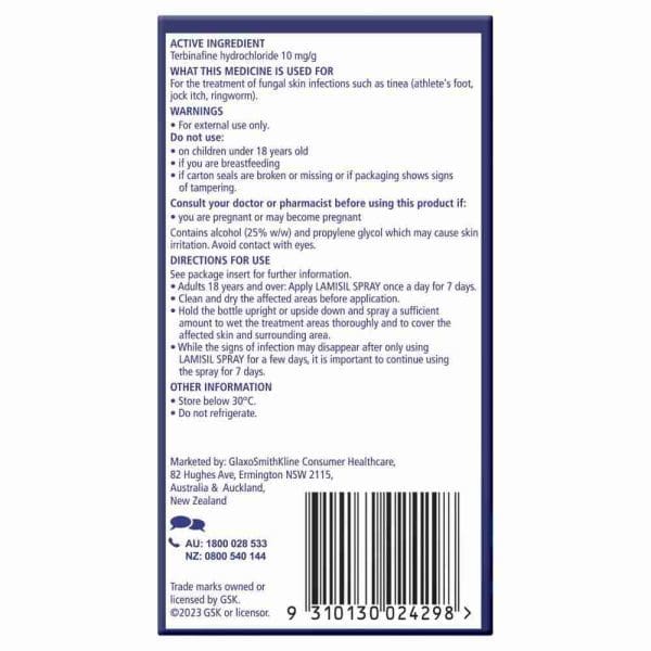 - Lamisil Spray is a convenient form of tinea treatment that allows application without the need to touch the infection. The active ingredient of Lamisil Sprays, terbinafine fights the infection by not only preventing the growth of the fungi, but by killing the fungal cells.