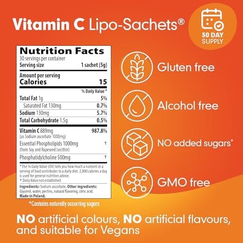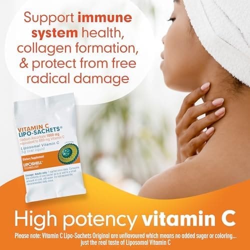 Liposomal vitamin C may not be the taste you’re used to with Vitamin C. Our Vitamin C 1000 mg gel Lipo-sachets are the real, unadulterated taste of vit c liposomal , unchanged by the addition of additives. The unusual taste is the result of natural vitamin c sodium being added to ascorbic acid to produce the vitamin C in Lipo-Sachets liposomal vit c and the absence of nasties often added to mask this taste. With repeated daily use your taste buds will become accustomed to the distinctive taste and you will begin to discover the health benefits that Vitamin C Liposomal gel sachets are intended to provide. The human body can’t produce vitamin C3 and eliminates unused vitamin C. Therefore we must get Vitamin C from food and/or supplements. To maintain adequate levels, it’s essential to take vitamin c liposomal 1000 mg regularly, and in a highly absorbable, high potency vitamin c form. Everyone can benefit from taking vitamin c liquid, but especially if you have a compromised immune system, symptoms of ills and chills, €˜run down’, tired or stressed, lead a very active lifestyle, travelling, live surrounded by pollutants and toxins. Vitamin C has antioxidant properties, supports the production of collagen, is great skin vitamins essential for maintaining the skin, blood vessels, bones, cartilage, gums and teeth, supports wound healing, supports iron absorption. Liposomes liquid vitamins target release of the 1000 mg vitamin c at locations in the body where it is required most, resulting in optimised absorption without gastric upsets. Take vitamin c 1000 directly from the vitamin c packets or mix the contents of the sachet with a small amount of a cool, still beverage to make a Vitamin C drink, chase it with a smoothie or fold into yoghurt. Note: Do not blend, process, or dissolve the contents of the sachet in hot liquid. We do not recommend that you add the contents to a full glass of beverage. Vegan Vitamin C, liquid vitamin c for adults