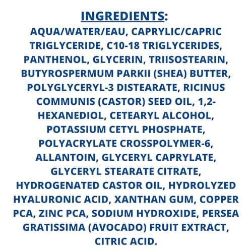 | ingredients | Aqua/water/eau, Caprylic/capric Triglyceride, C10-18 Triglycerides, Panthenol, Glycerin, Triisostearin, Butyrospermum Parkii (Shea) Butter, Polyglyceryl-3 Distearate, Ricinus Communis (Castor) Seed Oil, 1,2-hexanediol, Cetearyl Alcohol, Potassium Cetyl Phosphate, Polyacrylate Crosspolymer-6, Allantoin, Glyceryl Caprylate, Glyceryl Stearate Citrate, Hydrogenated Castor Oil, Hydrolyzed Hyaluronic Acid, Xanthan Gum, Copper Pca, Zinc Pca, Sodium Hydroxide, Persea Gratissima (Avocado) Fruit Extract, Citric Acid |