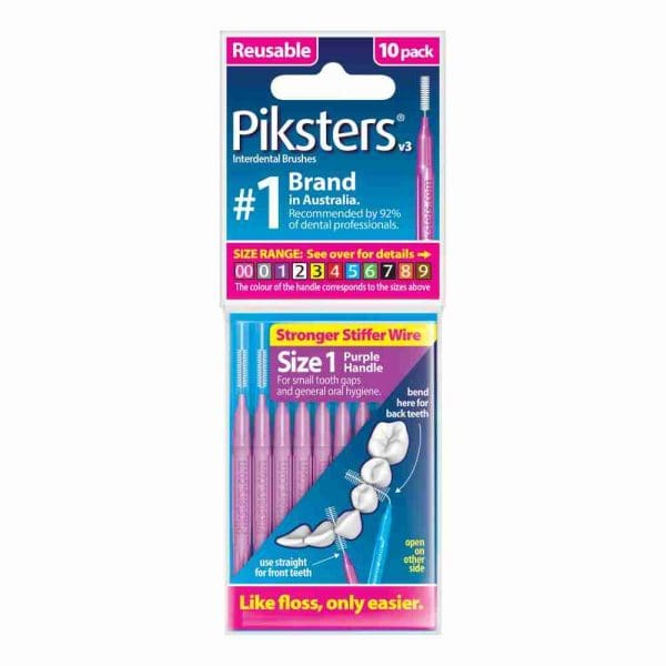 Piksters Interdental Brushes easily get into and clean tight areas of the mouth where a toothbrush cannot reach. The spaces between teeth can conceal parts of the tooth surface, by cleaning in the spaces you get the advantage of helping reduce decay and potential gum disease. These small size 1 brushes are ideal for small tooth gaps and inside gum pockets. Each brush features an extended purple handle and a flexible head for easy access to your molars and comfortable cleaning at any angle. The brush head consists of strong & stiff plastic-coated wire covered in soft, space-filling bristles to effectively trap and scrub away food particles and dental plaque.