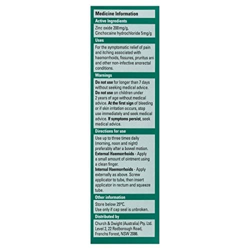 | safety_warning | Do not use longer than 7 days without seeking medical advice. Do not use on children under 2 years of age without medical advice. At the first sign of bleeding or if skin irritation occurs, stop use immediately and seek medical advice. If symptoms persist, seek medical advice. PHARMACY MEDICINE Keep out of reach of children. ALWAYS READ THE LABEL AND FOLLOW DIRECTIONS FOR USE. IF SYMPTOMS PERSIST TALK TO YOUR HEALTH PROFESSIONAL. |