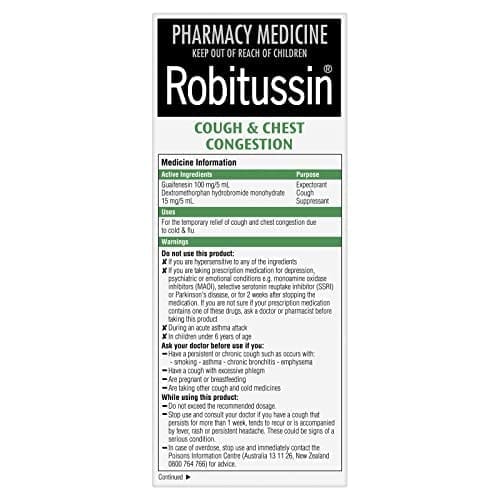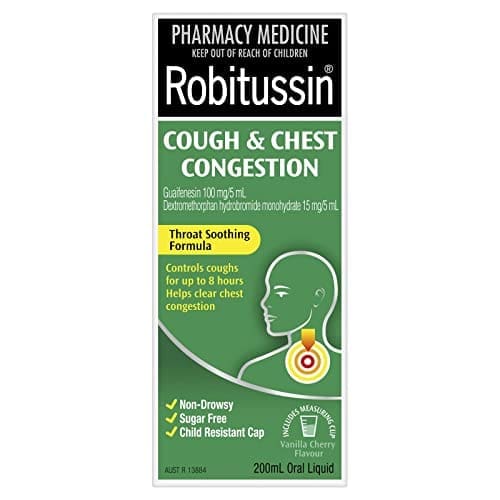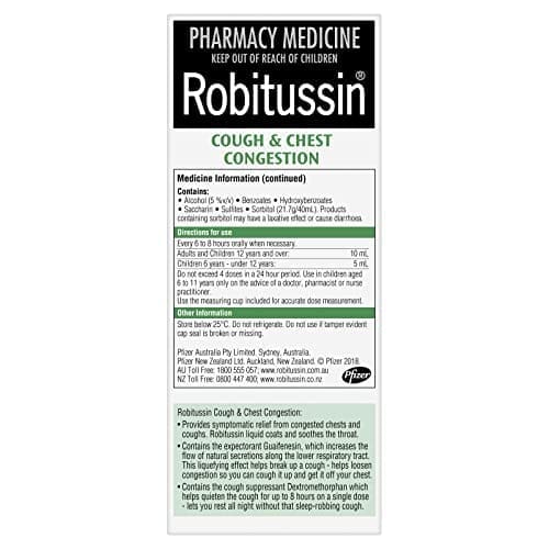 Robitussin Cough & Chest Congestion provides symptomatic relief from congested chests and coughs. Robitussin liquid coats and soothes the throat. It contains the expectorant Guaifenesin, which increases the flow of natural secretions along the lower respiratory tract. This liquefying effect helps break up a cough and loosen congestion so you can cough it up and get it off your chest. It also contains the cough suppressant Dextromethorphan which helps quieten the cough for up to 8 hours on a single dose –lets you rest all night without that sleep robbing cough.