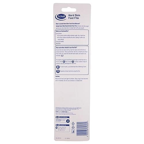 Ensure feet are clean and dry. Use the coarse side of the file to remove hard skin. Then use the finer side for a smooth and refined finish. After use, wash the file with warm water and leave to dry naturally. The experts at Scholl know that the best way to treat hard skin is first to soften then remove so have created a range of products specially developed for hard skin. 1. For best results, use Scholl Hard Skin Softening Cream. 2. Regularly remove hard skin using this file.