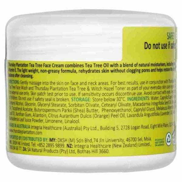 Contains 100% pure Australian Tea Tree Oil to help maintain clear skin KEY FEATURES Restores the skin’s natural moisture balance after clensing and toning Hydrates skin without clogging pores Contains 100% pure Australian Tea Tree Oil to help maintain clear skin Non-greasy formula Suitable for all skin types