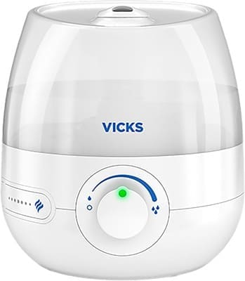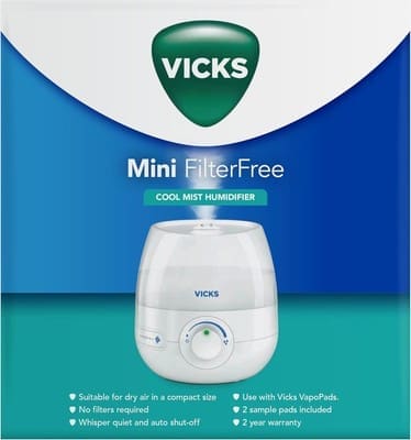 The Vicks Mini Filter Free Cool Mist Humidifier adds essential moisture to your home, helping to maintain proper humidity levels and relieve cough and congestion throughout the year. It enhances indoor air quality at 40%-60% RH, relieving dryness of the skin, chapped lips, dry eyes, and allergy flare-ups. Compact and quiet, this filter-free unit features variable mist control for customized output and works with 2 included Vicks VapoPads for soothing comfort.