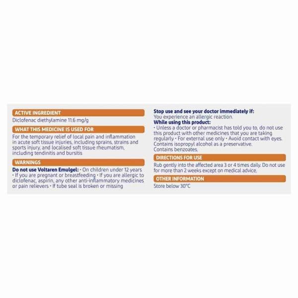 Voltaren Emulgel can be used for the relief of body pain, inflammation and swelling in Soft-tissue injuries, trauma of the tendons, ligaments, muscles and joints, due to sprains, strains, bruises and backache (e.g. in sports injuries), Localised forms of soft tissue rheumatism including tendonitis and bursitis.Voltaren Emulgel formula combines the qualities of a gel and a cream, that has an appealing smell, is easy to rub in and rapidly absorbed, and even provides a cooling and soothing effect when applied to the skin. Delivering pain relief to help you get back to the movement that you love!