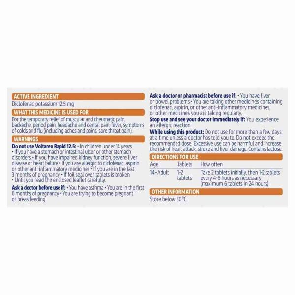 Voltaren Rapid 12.5 tablets can also be used for pain relief when inflammation may be at play. This can include painful conditions such as Headaches, Dental Pain & Period Pain.