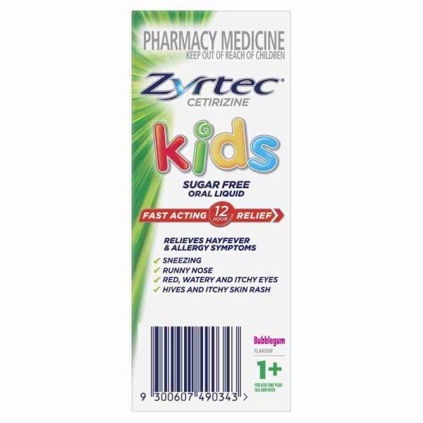 Zyrtec® Kids Rapid Acting 12 hour Allergy & Hayfever Relief Antihistamine Oral Liquid Bubblegum flavour relieves hayfever & year around allergy symptoms, and is sugar, gluten and dye free. Zyrtec Kids Oral Liquid Bubblegum flavour is suitable for children 1+ and has a measuring cup included.